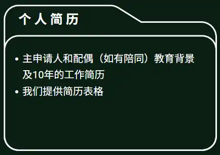 - 主申请人和配偶(如有陪同)教育背景 及10年的工作简历