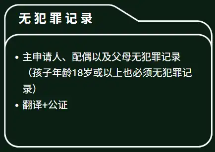 - 主申请人、配偶以及父母无犯罪记录 (孩子年龄18岁或以上也必须无犯罪记 录)